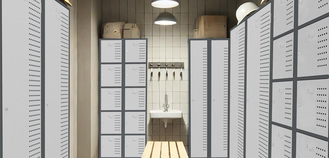 The shelving units feature adjustable shelves in 50 or 100 mm increments, enabling optimal organization of tools, materials, or personal effects. In the locker version, clothes rails with sliding hooks accommodate uniforms or coats, while towel holders and compartments maintain separation. An optional bench with a stainless steel shoe grate supports quick donning and removal of safety footwear. This seating facilitates ergonomic changing and streamlines maintenance of high?traffic staff areas.