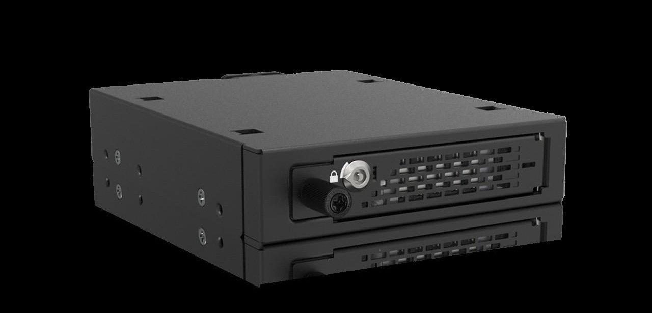 The drive bay module incorporates a dual-lock mechanism designed for critical applications, combining a cylinder lock that blocks unauthorized SSD removal with a knurled thumbscrew that anchors the tray within its housing. This protective system reduces the risk of media disconnections caused by mechanical shock or vibration. By preventing accidental ejection under strenuous conditions, it ensures uncompromised data integrity in various environments such as autonomous vehicles, robotics, and military equipment.
